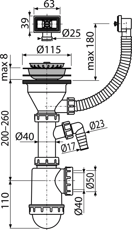 Syfon zlewozmywaka z przyłączem i elastyczną rurą, sitko nierdzewne DN115