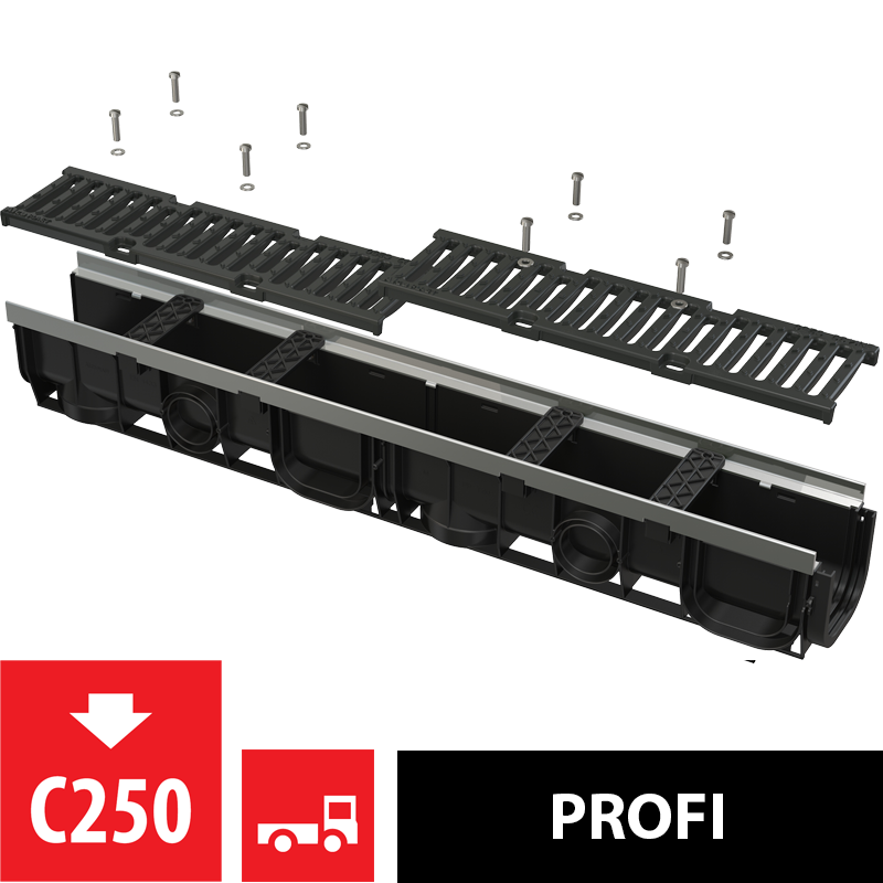 - Żeliwny ruszt – mocowany w odwodnieniu za pomocą 8 śrub ze stali nierdzewnej, szerokość szczeliny wlotowej 12,5 mm