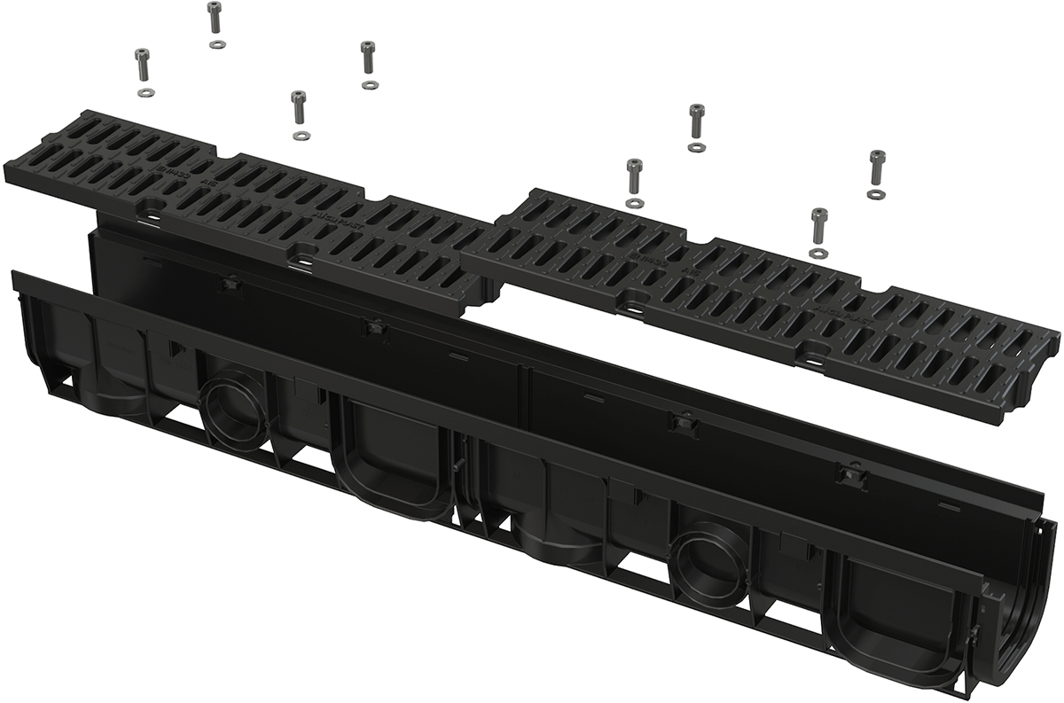 - Żeliwny ruszt – mocowany w odwodnieniu za pomocą 8 śrub ze stali nierdzewnej, szerokość szczeliny wlotowej 14 mm