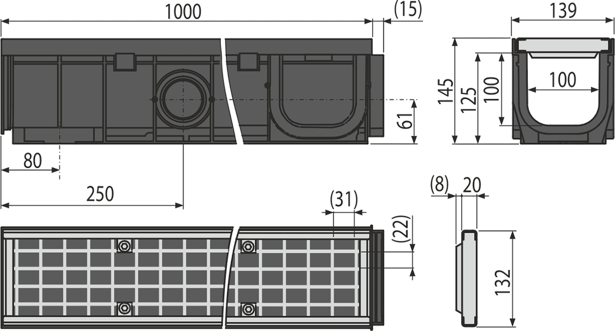 Odwodnienie zewnętrzne 100 mm z obramowaniem z tworzywa, ruszt ocynkowany, B125