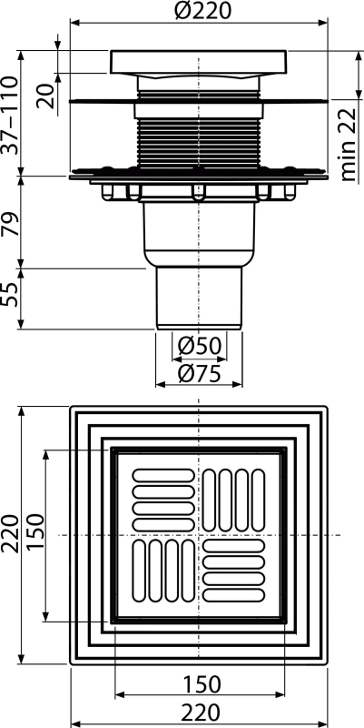 Kratka ściekowa 150×150/50/75 mm odpływ pionowy, kratka nierdzewna, kołnierz nierdzewny, dwa poziomy izolacji, syfon mokro-suchy