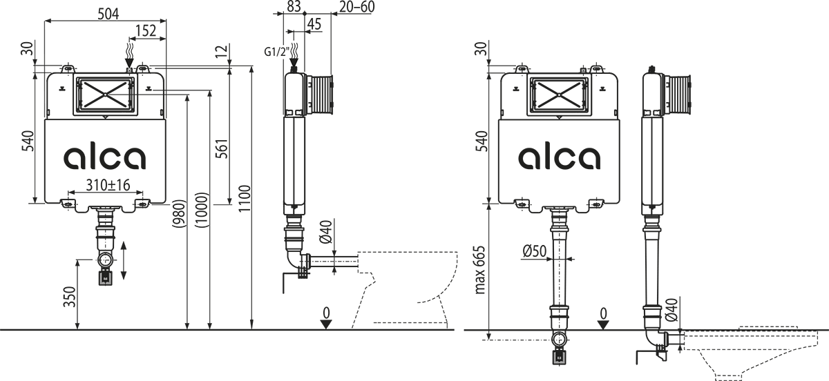 Podłączenia wody od tyłu lub od góry otworami montażowymiG1/2 "