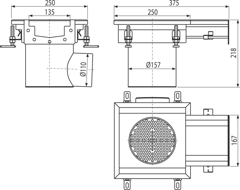 Przemysłowy odpływ punktowy z wpustem skrzynkowym 250×250-135, stal nierdzewna AISI 304