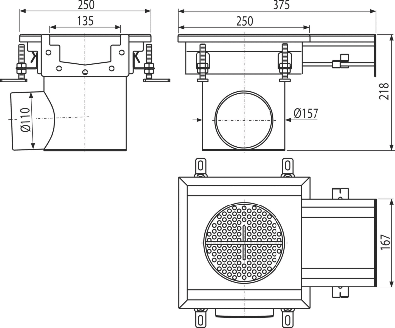 Przemysłowy odpływ punktowy z wpustem skrzynkowym 250×250-135, stal nierdzewna AISI 304