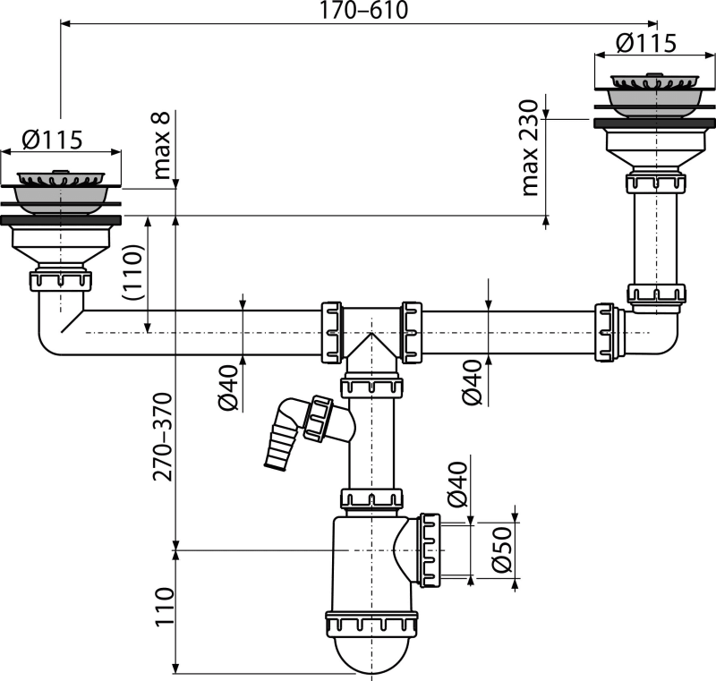 Syfon zlewu dwukomorowego dwupoziomowego z przyłączem, sitka nierdzewne DN115