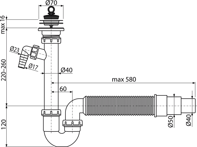 Syfon rurowy do zlewozmywaka z przyłączem i elastyczną rurą, sitko nierdzewne DN70